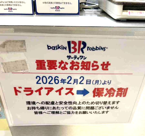 モラージュ菖蒲のサーティワン店舗の告知でも、「2月よりドライアイスから保冷剤に切り替わりました」と正式にアナウンスされています。