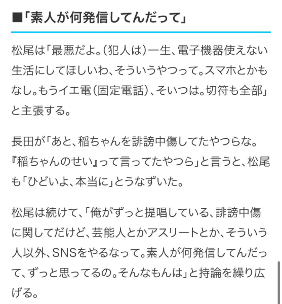 「素人はSNSやるな」という語が強く、「全ての一般人を否定している」のか、「誹謗中傷をする人を戒めたい」のか、聞いている人の意見が割れてしまった今回の騒動。